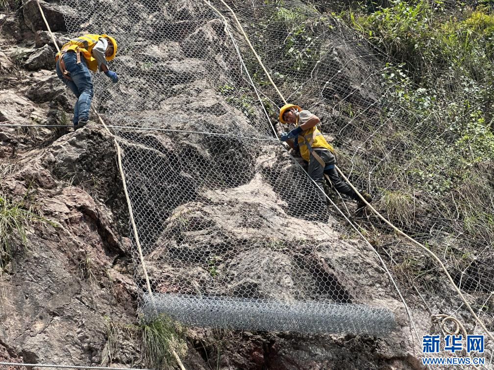 周林蒼帶領隊員一路攀爬,來到要安設主動防護網的坡面。這塊巖體高80余米,向下望去令人生畏。他們系好安全繩,猶如“蜘蛛俠”一般,沿著峭壁小心翼翼從上至下,到達坡面。