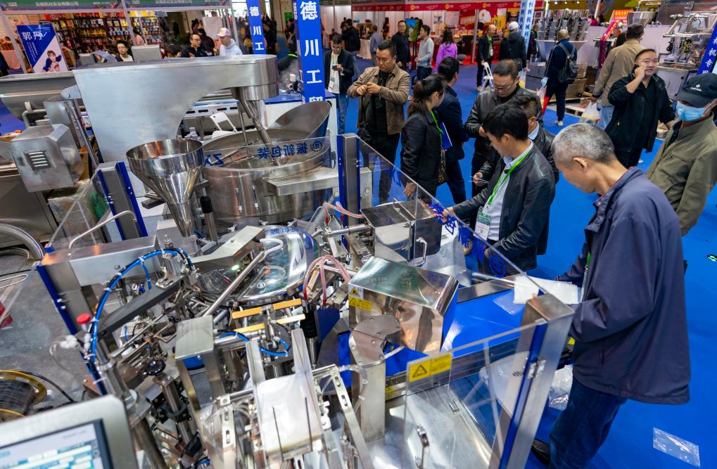 10月13日,參觀者在云南國際餐飲美食暨預制菜產業博覽會上參觀一臺食品包裝設備。