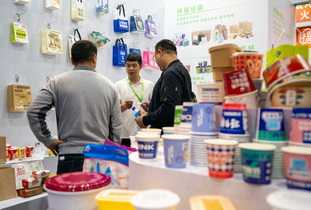 10月13日,一名參展商(左二)在云南國際餐飲美食暨預制菜產業博覽會上向兩名參觀者介紹食品包裝產品。