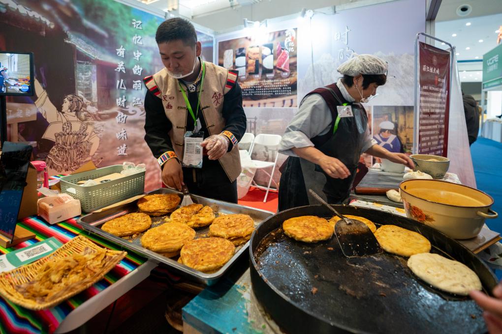 10月13日,兩名參展商在云南國際餐飲美食暨預制菜產業博覽會上制作麗江粑粑。