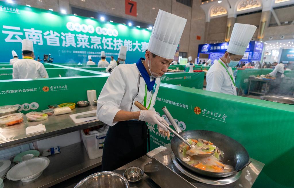 10月13日,參賽選手在云南國際餐飲美食暨預制菜產業博覽會上參加云南省滇菜烹飪技能大賽。