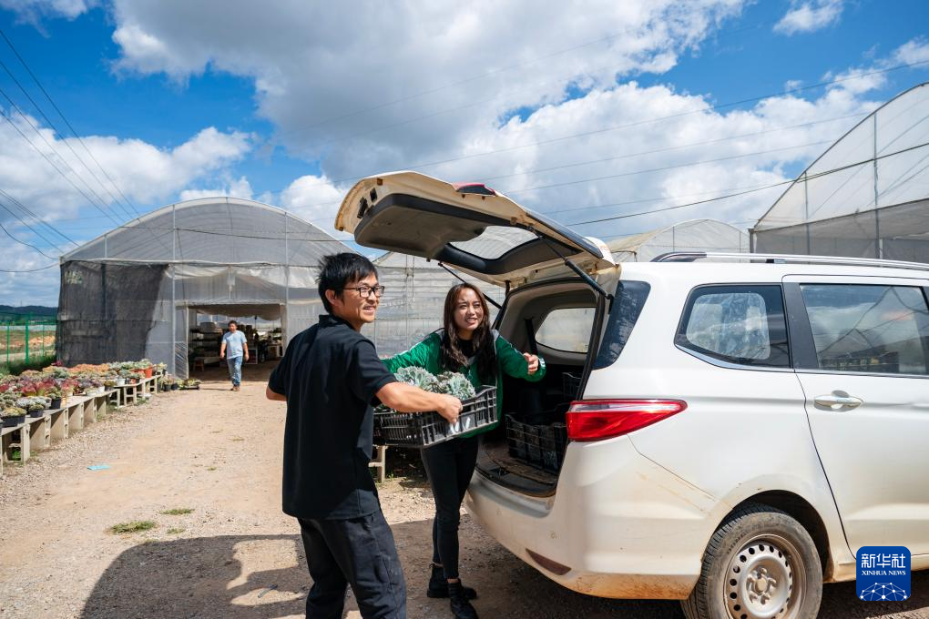 10月18日,李思敏(右)和同事在位于晉寧區寶峰街道的直播基地搬運多肉植物。新華社記者 陳欣波 攝