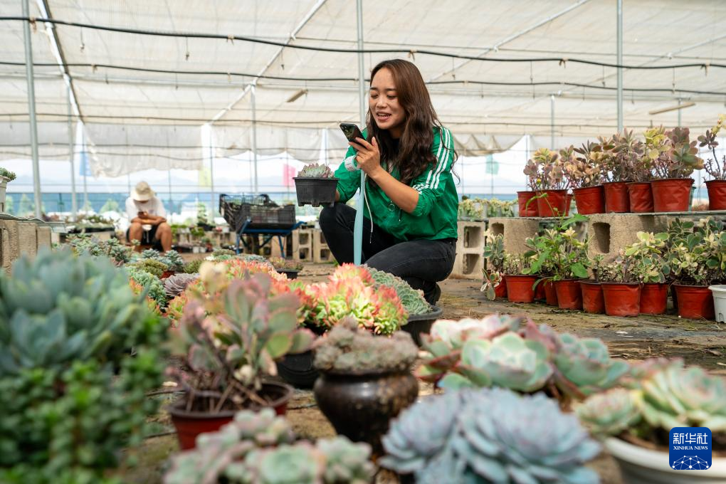 10月18日,李思敏在位于晉寧區寶峰街道的直播基地寄養區查看顧客寄養的多肉植物。新華社記者 陳欣波 攝