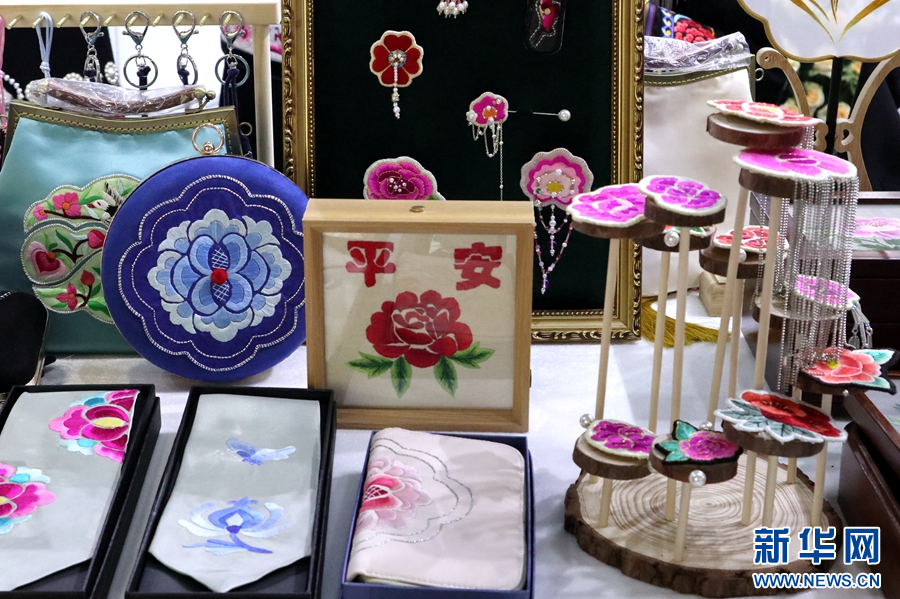 以楚雄彝族刺繡為主要元素制作的各類文創產品(10月20日攝)。新華網 念新洪 攝