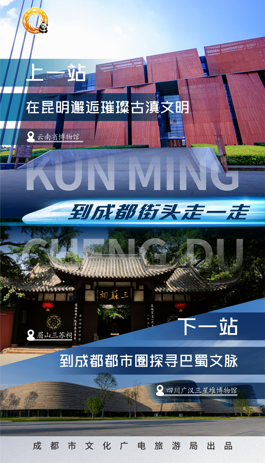 昆明市內有云南省博物館、昆明市博物館等多家文博場館,在這里可以邂逅璀璨的古滇文明。在成都、德陽、眉山、資陽四城,同樣有金沙遺址、三星堆遺址、三蘇祠、安岳石刻等名勝古跡。邀請大家到成都街頭走一走,打卡博物館,感受燦爛的歷史文化與美好的生活。