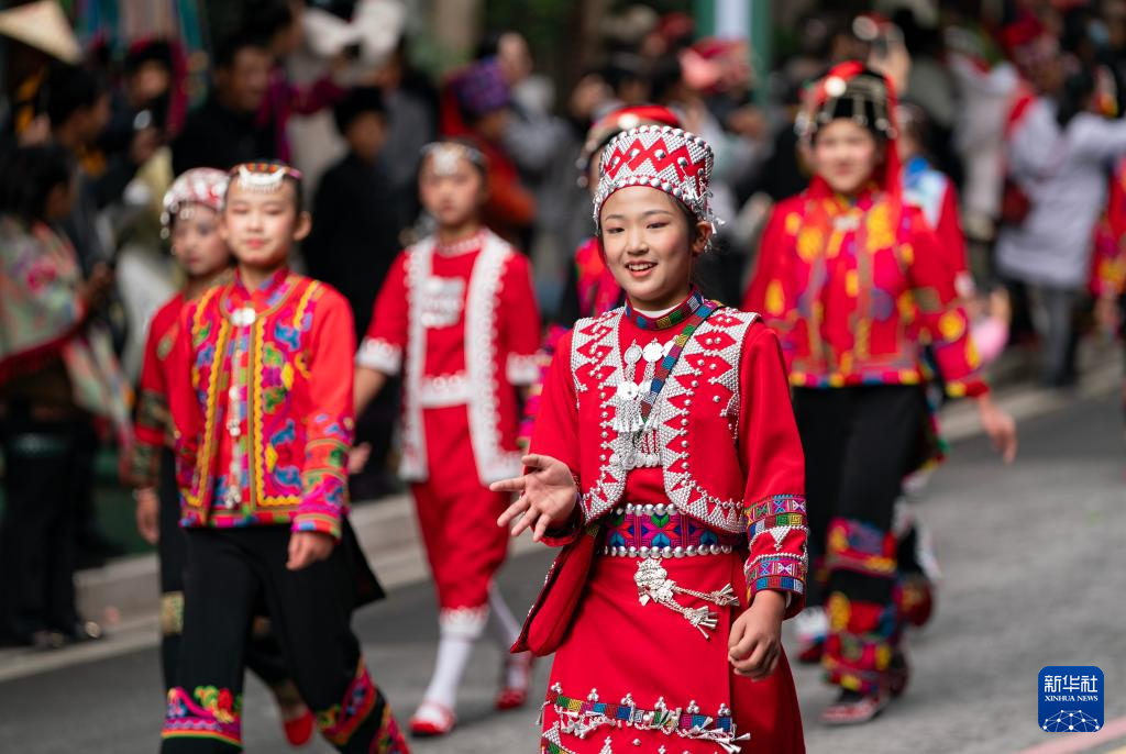 11月19日,綠春縣哈尼族群眾參加哈尼長街古宴巡游展演。新華社記者 陳欣波 攝