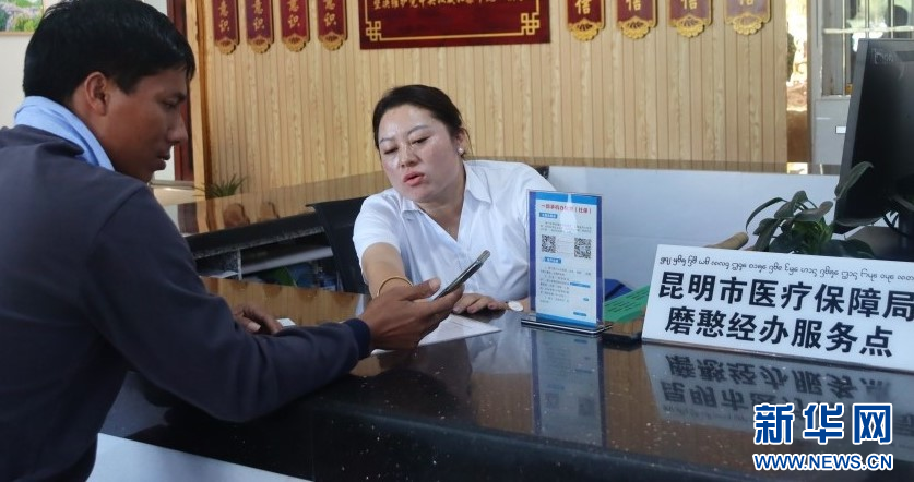 昆明市醫療保障局磨憨醫保經辦服務點工作人員正在為一位邊民辦理參保業務(11月21日攝)。新華網發(陳會敏 攝)