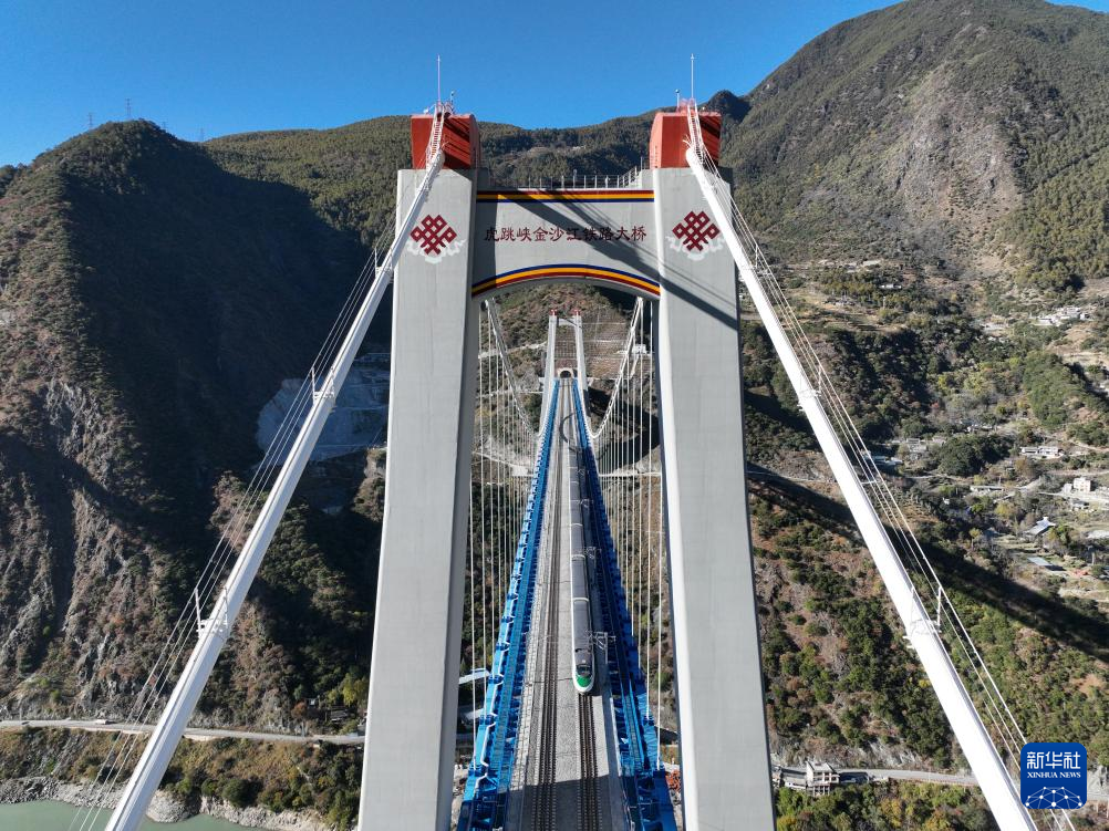 11月25日,列車通過麗香鐵路金沙江特大橋(無人機照片)。新華社記者 邢廣利 攝