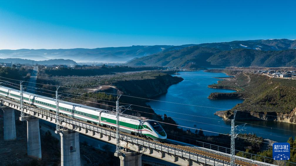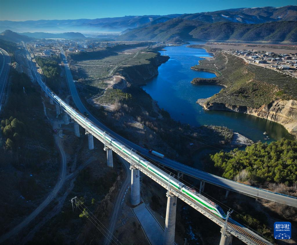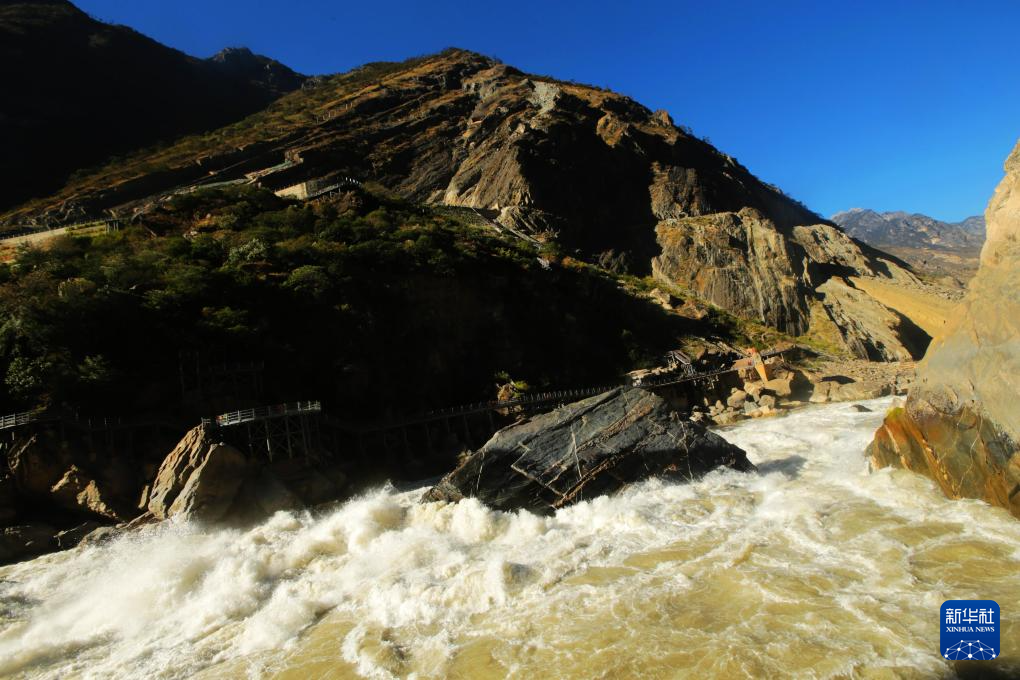 11月26日,列車駛過虎跳峽金沙江鐵路大橋。