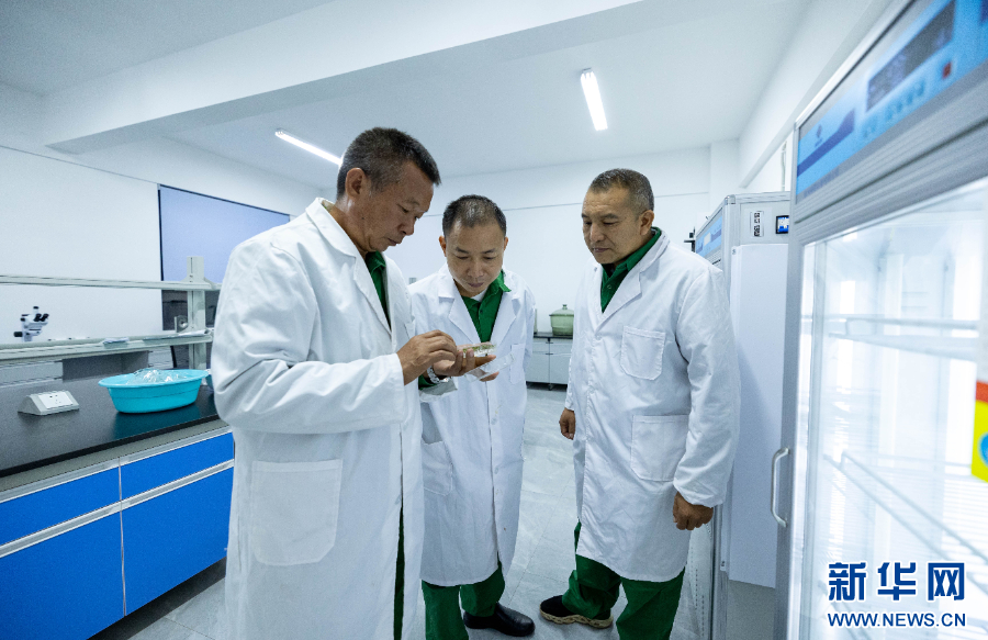 楊長楷(左一)和團隊成員觀察種子出芽情況(2022年11月4日攝)。新華網發(李浩 攝)