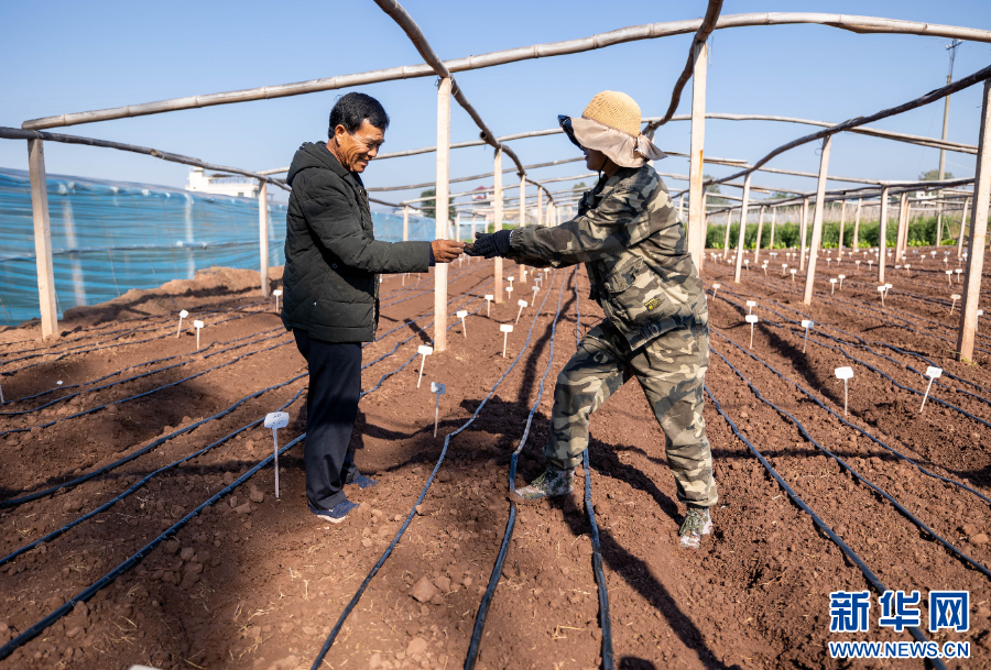 武成勇與專家查看自研番茄品種生長狀況(10月20日攝)。新華網發(李浩 攝)