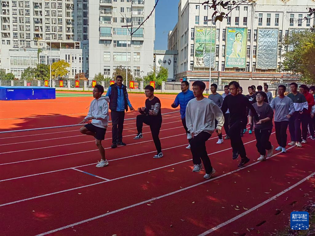 老師帶領學生進行熱身。新華社記者 岳冉冉 攝