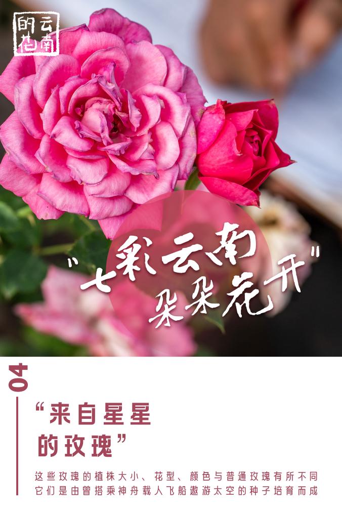 云南省安寧市現代農業園區玫瑰種植示范園里,一株株玫瑰美麗綻放。這些玫瑰的植株大小、花型、顏色與普通玫瑰有所不同。它們是由曾搭乘神舟載人飛船遨游太空的種子培育而成,因此也被稱為“來自星星的玫瑰”。