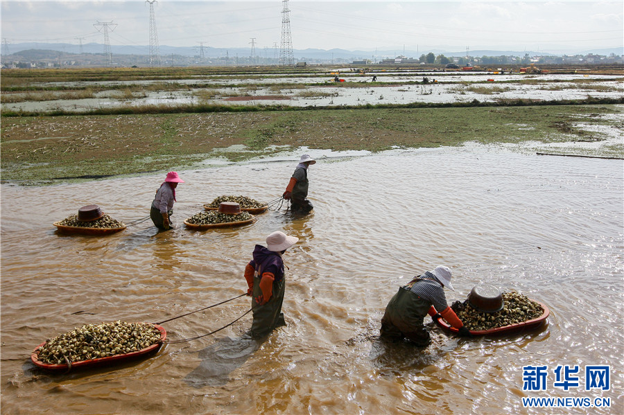 務工人員在云南省曲靖市沾益區盤江鎮小后所村的農田里采收茨菇(12月2日攝)。新華網發(楊俊鵬 攝)