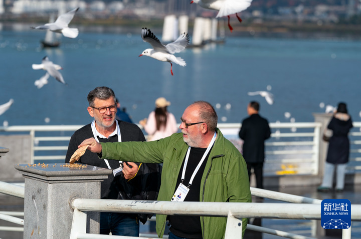 12月7日,世界媒體峰會參會代表在昆明海埂大壩喂紅嘴鷗。新華社記者 陳欣波 攝