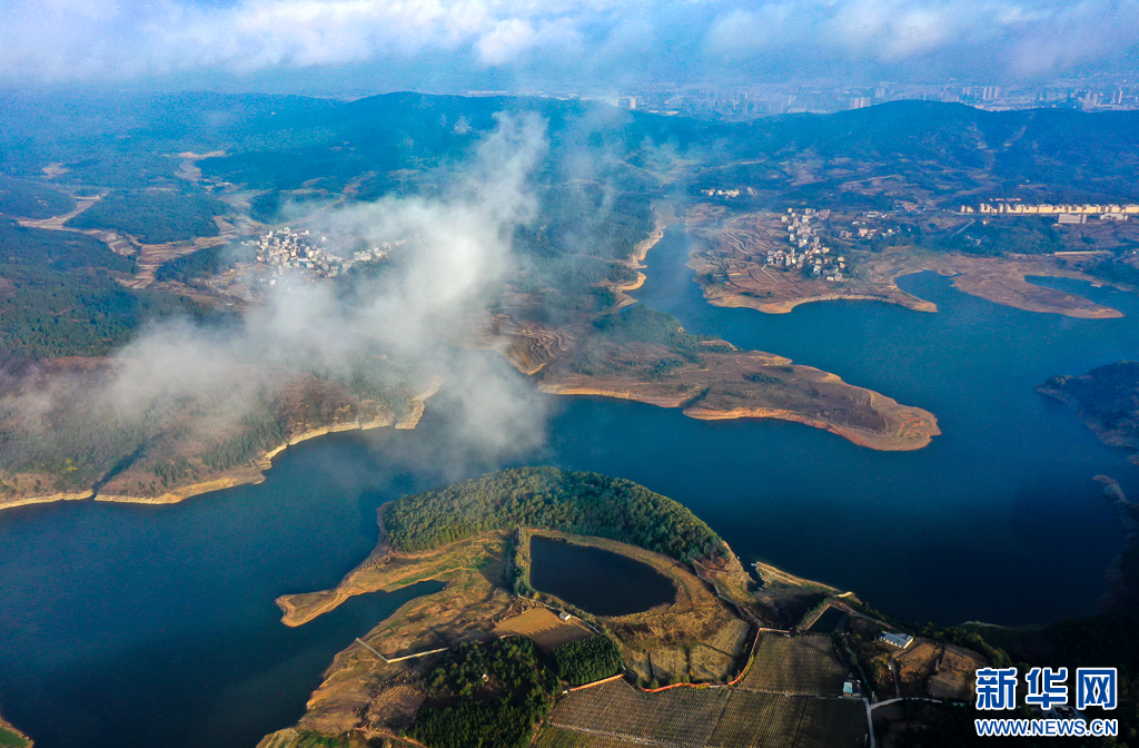 云霧繚繞的瀟湘水庫。新華網發(中共曲靖市委宣傳部供圖)