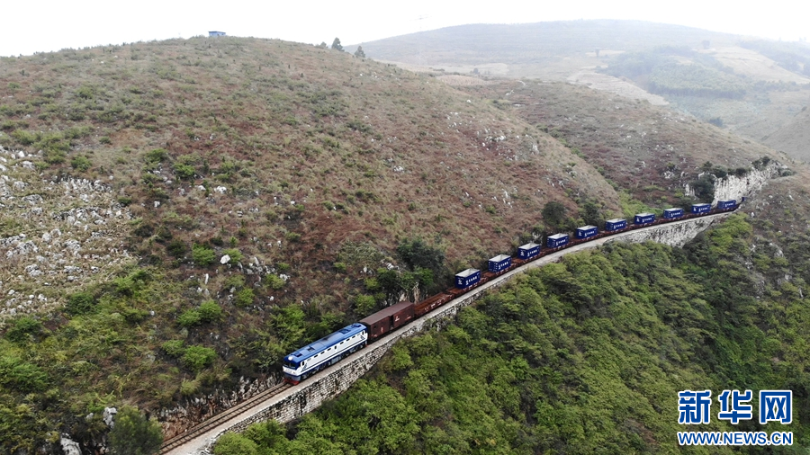 開遠市玉林山山間,一列中越米軌鐵路國際聯運列車行駛在線路上(資料圖)。新華網發(劉昊亮 攝)