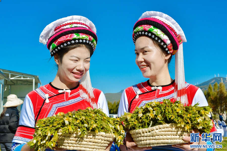 身著白族服飾的大理“金花”展示人工種植的海菜(資料圖)。新華網發(羅新才 攝)