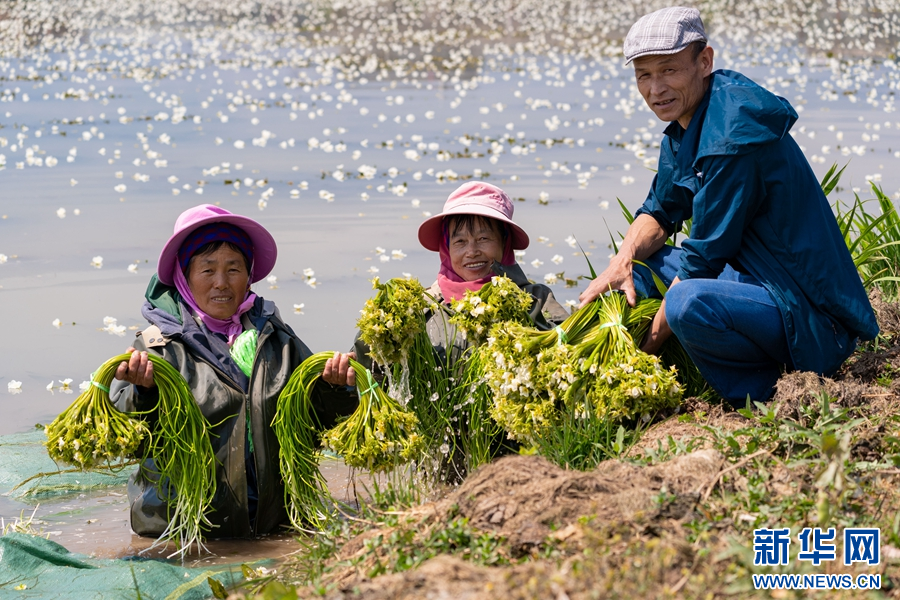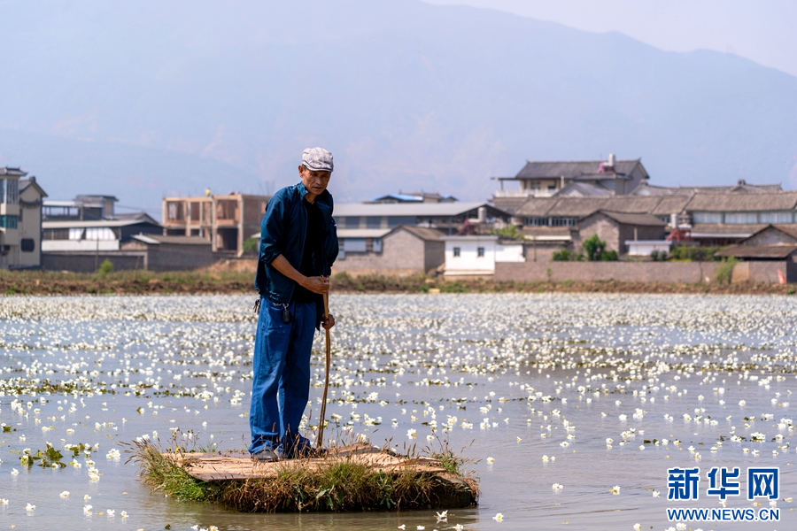 海菜花,一種白花黃蕊的沉水植物,對水質要求非常高,只有在溫暖清澈的河湖里才能生長,被譽為“清流精靈”。海菜花的莖葉口感鮮嫩,是一種美味的食材,大理當地老百姓稱之為“海菜”。近年來,洱源縣在推進洱海流域水質保護與農業轉型升級的過程中,將人工種植海菜作為一大綠色生態產業進行扶持和培育,目前,東湖的松曲、永安等地已實現連片種植,總面積2300多畝,年產量可達4300多噸。