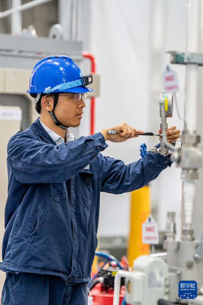 工作人員在右岸地下廠房對水輪發電機組調速器壓力油罐壓力表進行檢查更換(12月22日攝)。新華社記者 胡超 攝