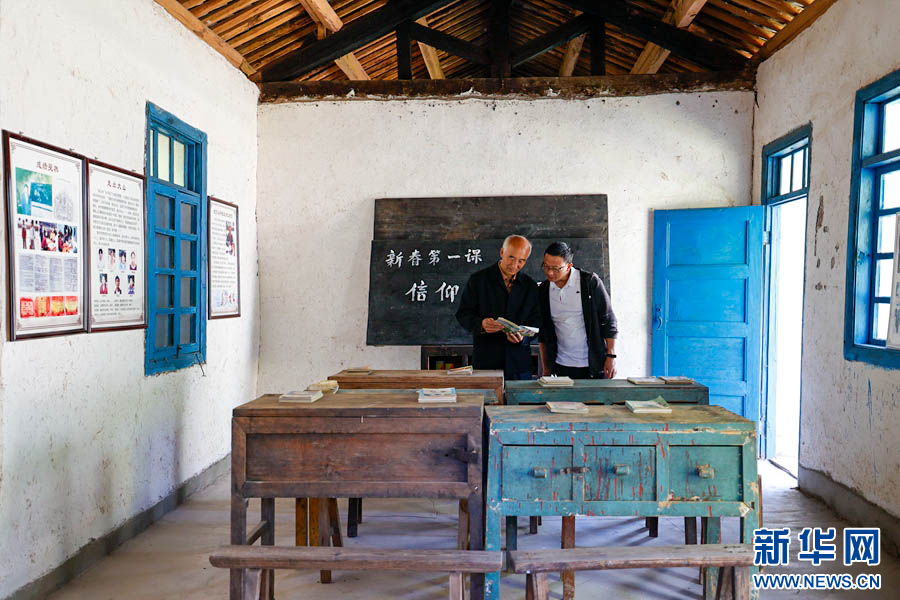 李桂科和宋榮坤在以前的教室里翻看老課本(攝于9月14日)。新華網 趙普凡 攝