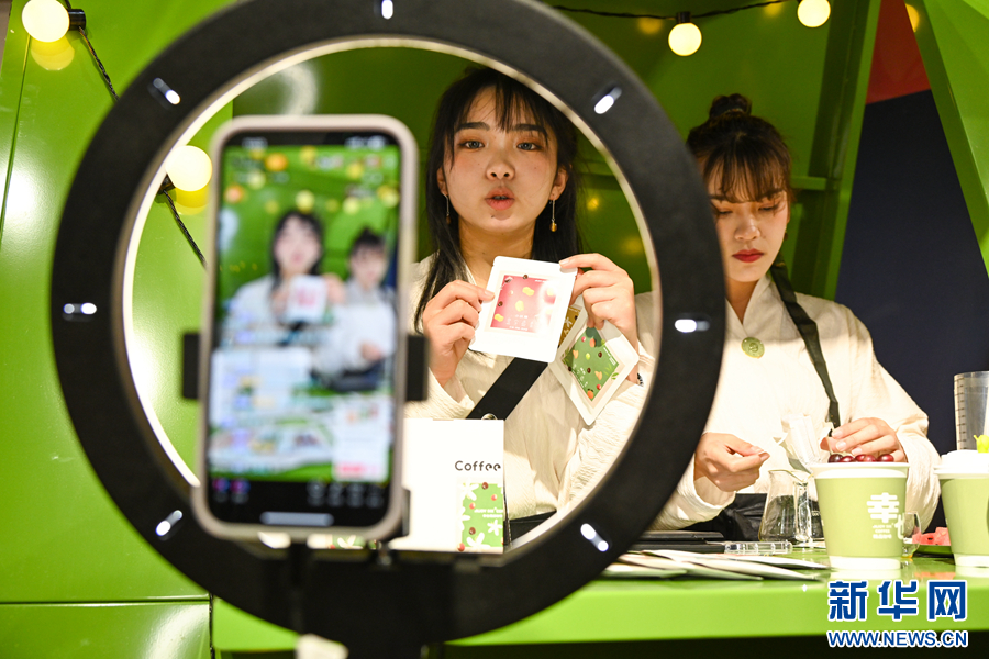 參展商線下參展的同時進行線上直播帶貨(1月5日攝)。新華網發(劉起 攝)