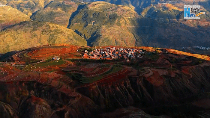 紅黃綠三色拓印在連綿起伏的丘陵上