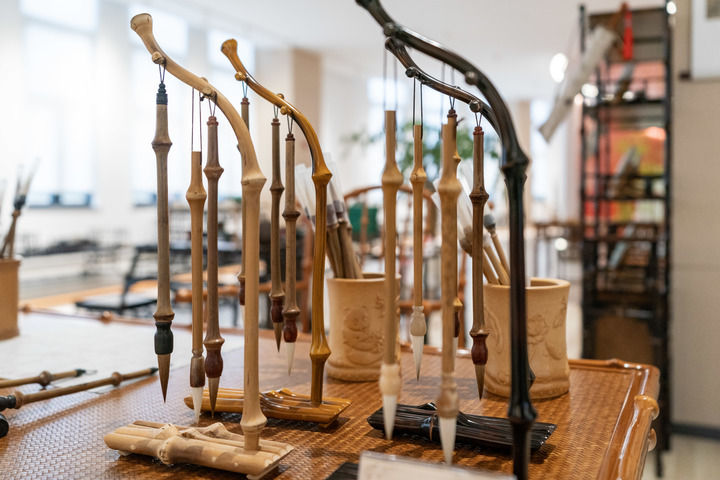 在云南昭通市大關縣“80后”返鄉創業者歐賢芹的筇竹家具企業內拍攝的筇竹毛筆及毛筆架(2023年10月31日攝)。新華社記者 陳欣波 攝
