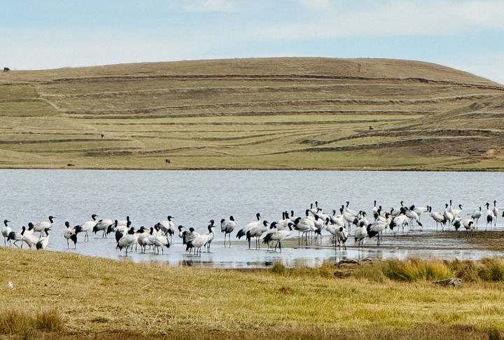 在云南昭通大山包黑頸鶴國家級自然保護區拍攝到的黑頸鶴(2023年11月2日攝)。新華社發(吳太平 攝)