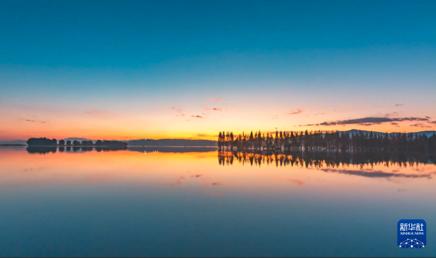 冬日,位于云南晉寧的南滇池濕地,晨曦中,云朵掩映紅日,霞光綻放,喚醒萬物。