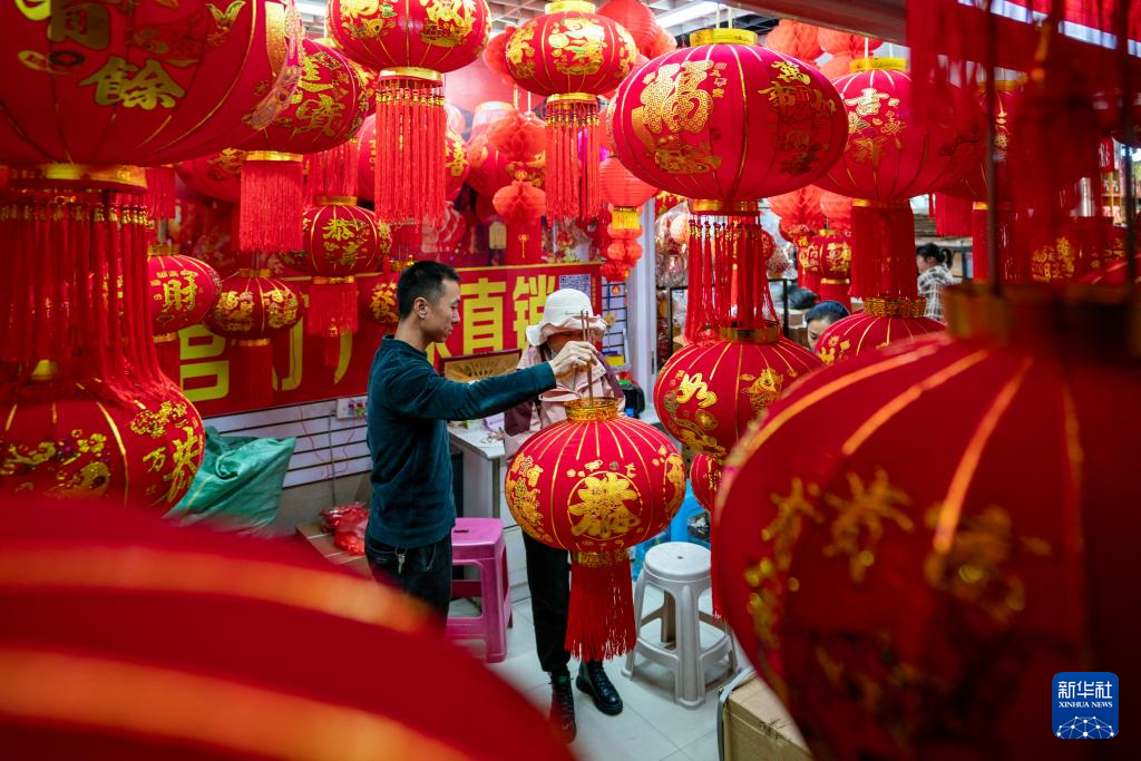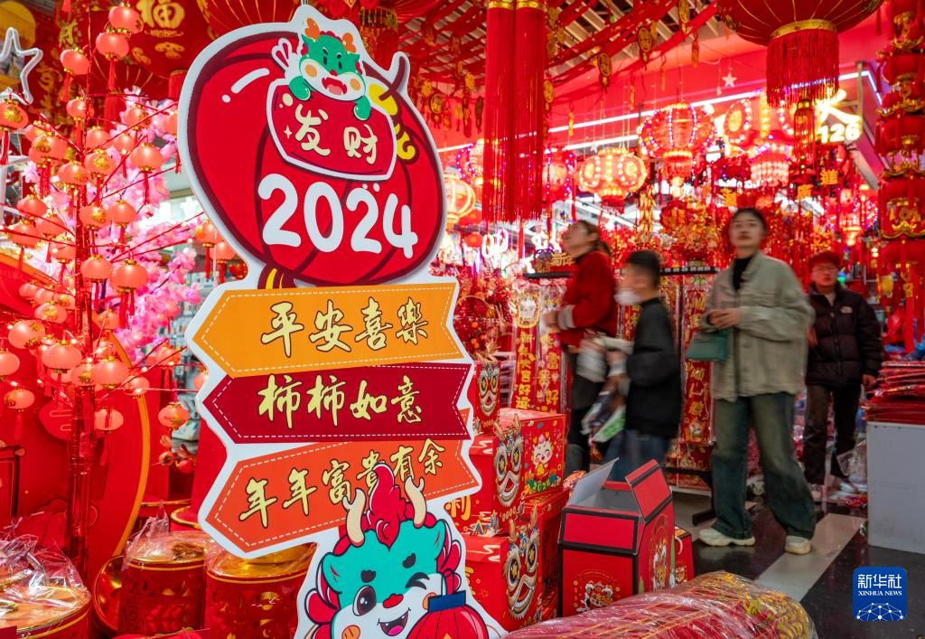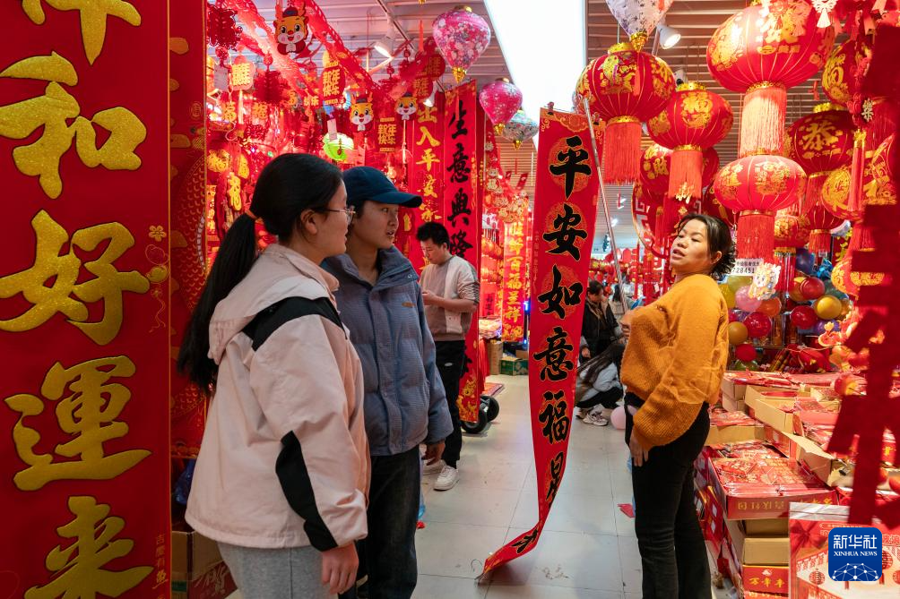 龍年春節臨近,云南昆明新螺螄灣國際商貿城內的節日飾品購銷兩旺,春聯、燈籠、龍年掛飾、中國結等受到顧客青睞。