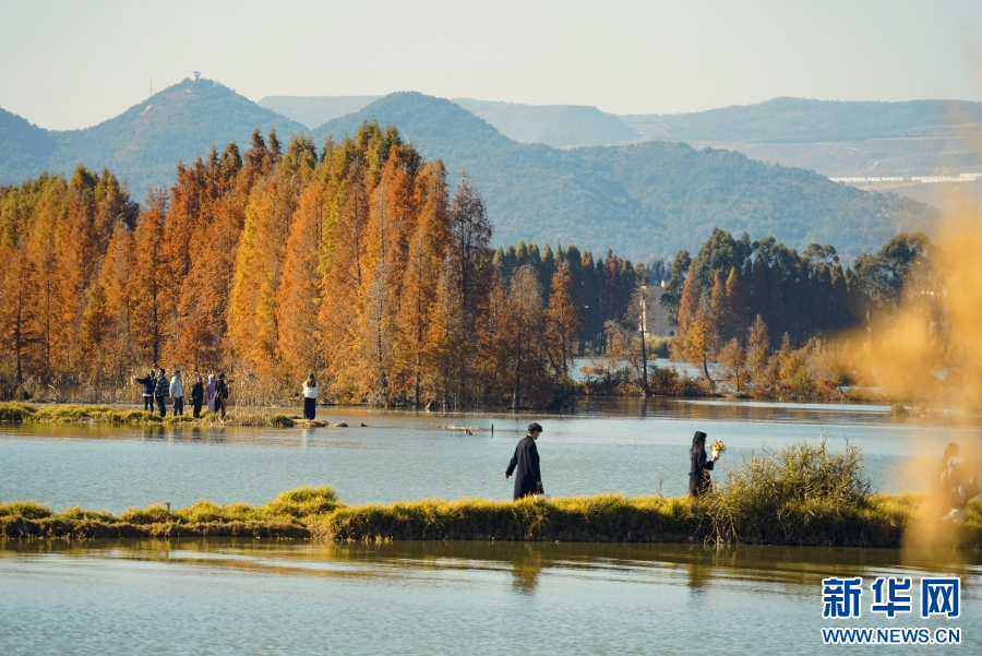 水杉、湖水、游客融為一體(1月13日攝)。新華網發(楊景浩 攝)