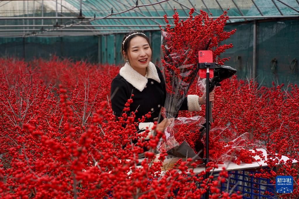 1月23日,在云南省昆明市晉寧區一家北美冬青種植基地,一名工作人員在大棚里直播銷售。新華社記者 崔文 攝