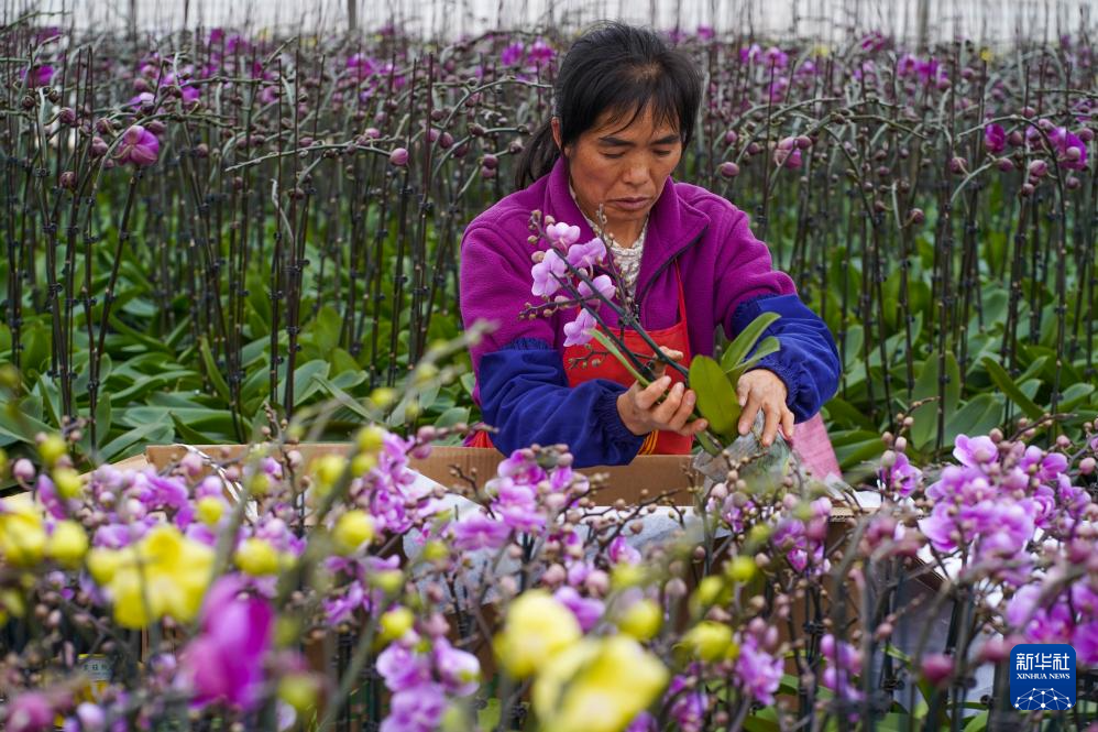 1月23日,在云南省昆明市晉寧區一家鮮花基地,花農在打包蝴蝶蘭。新華社記者 崔文 攝
