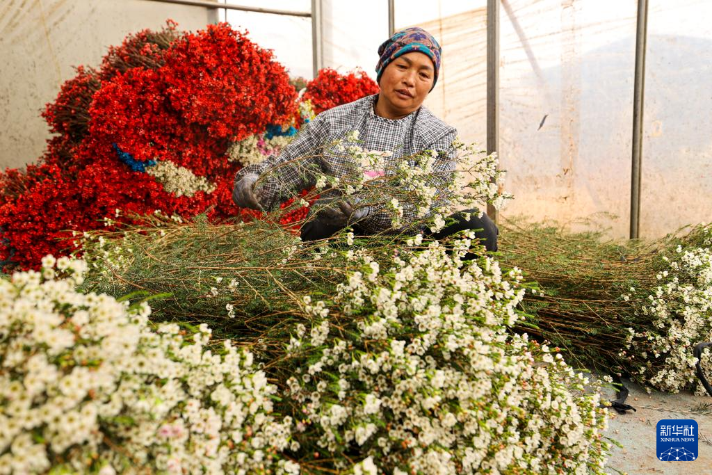 1月23日,在云南省昆明市晉寧區一家臘梅種植基地,花農在整理花卉。新華社記者 崔文 攝