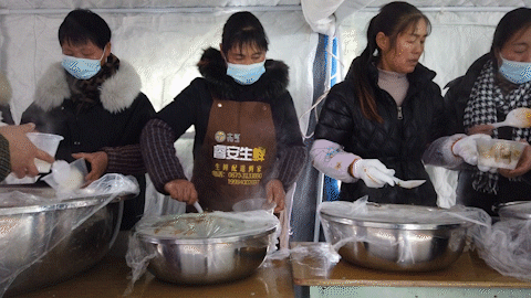雖然現場還飄著小雪,但臨時安置點內卻熱氣騰騰。12時許,工作人員和志愿者端出了剛炒好的回鍋肉、西紅柿蛋湯等菜品,開始為臨時安置群眾發放午餐。午餐包含4菜1湯,葷素搭配。