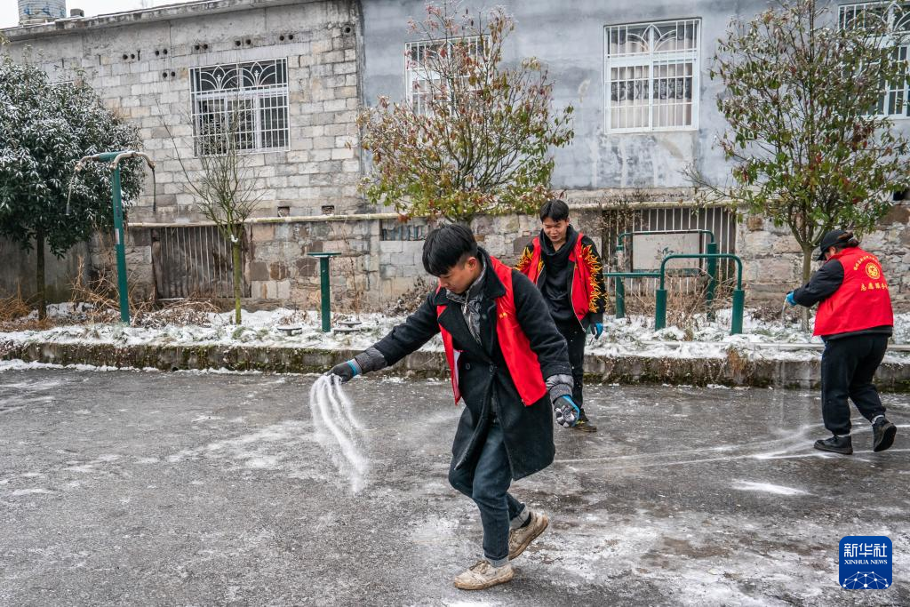 1月24日,在鎮雄縣塘房鎮涼水村和平小學老校區安置點,志愿者在結冰的地面上撒鹽防滑。