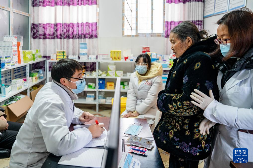 1月24日,在鎮雄縣塘房鎮涼水村和平小學老校區安置點,醫生在臨時醫療點給受災群眾看病。