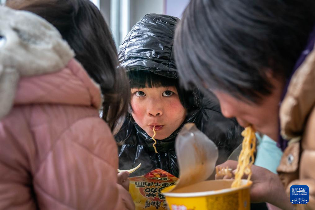 1月24日,小朋友在鎮雄縣塘房鎮涼水村和平小學老校區安置點吃泡面。