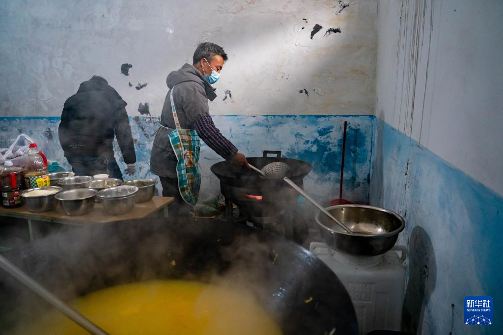 1月24日,在鎮雄縣塘房鎮涼水村和平小學老校區安置點,周邊村寨的村民幫忙炒菜。