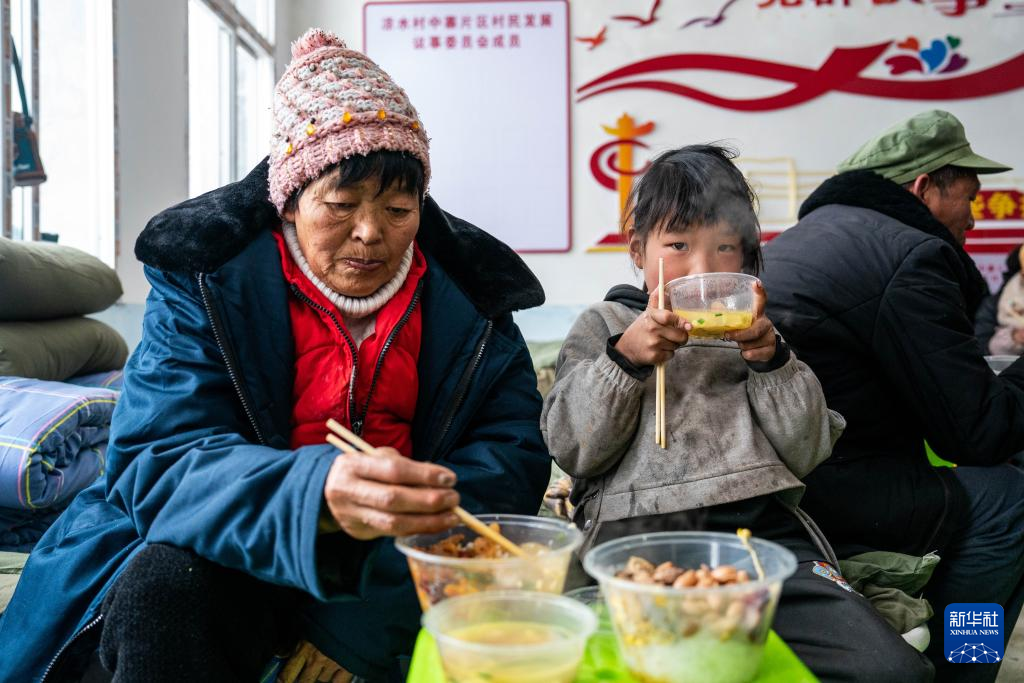 1月24日,受災群眾在鎮雄縣塘房鎮涼水村和平小學老校區安置點吃飯。