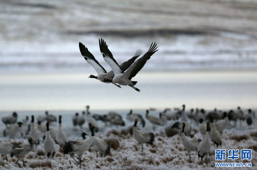 黑頸鶴飛過湖面(攝于1月22日)。新華網發(昭陽區融媒體中心供圖)