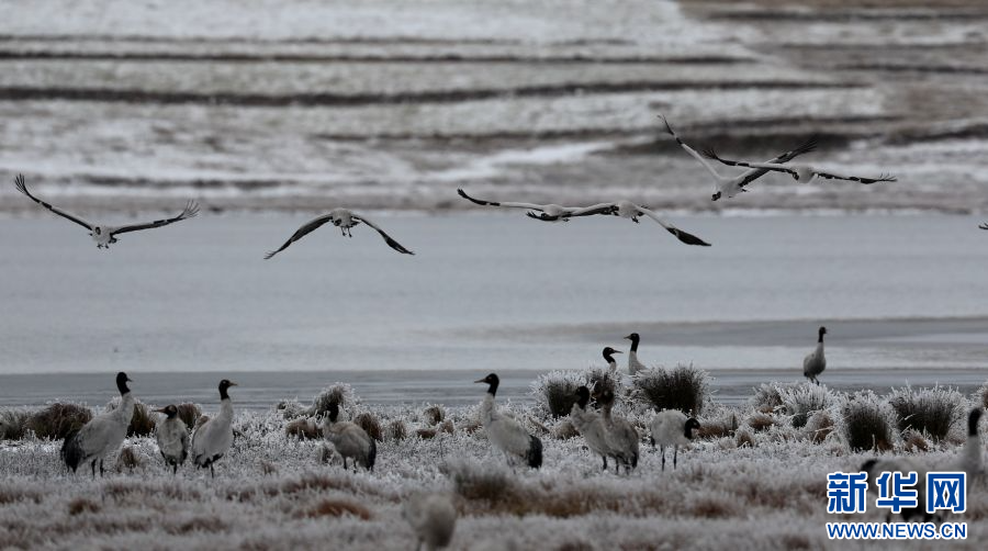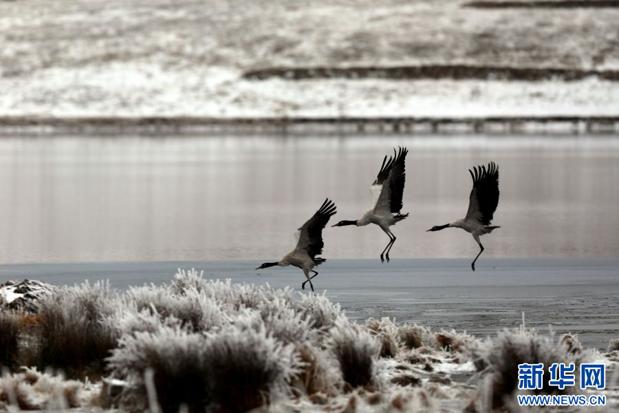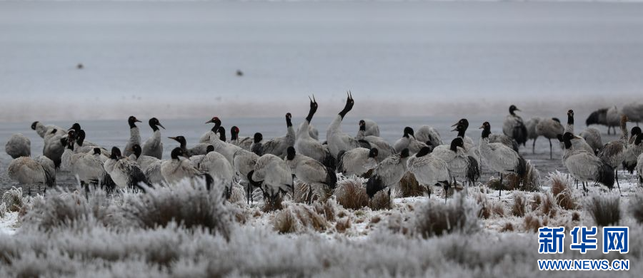 冰雪中的黑頸鶴(攝于1月22日)。新華網發(昭陽區融媒體中心供圖)