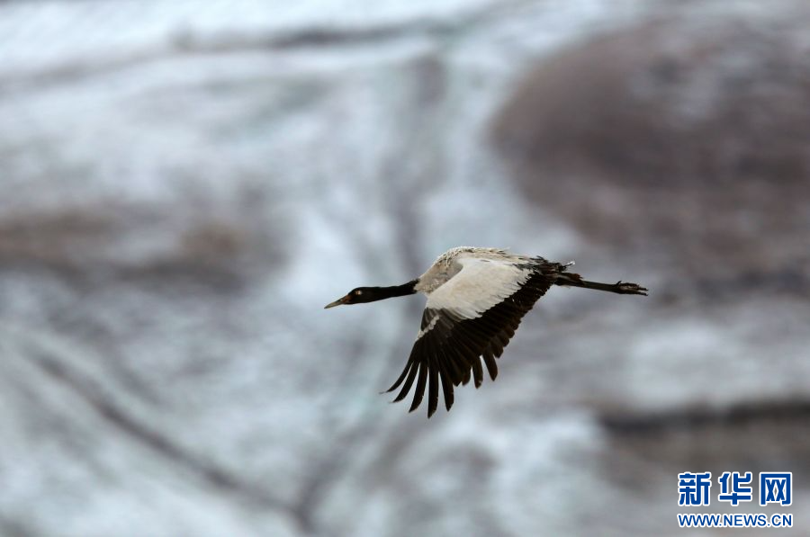 黑頸鶴展翅飛翔(攝于1月22日)。新華網發(昭陽區融媒體中心供圖)