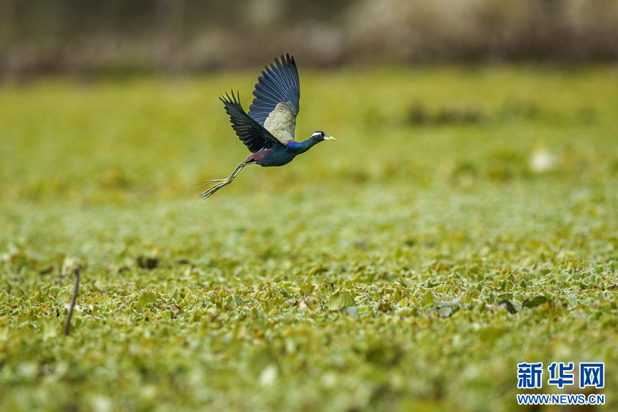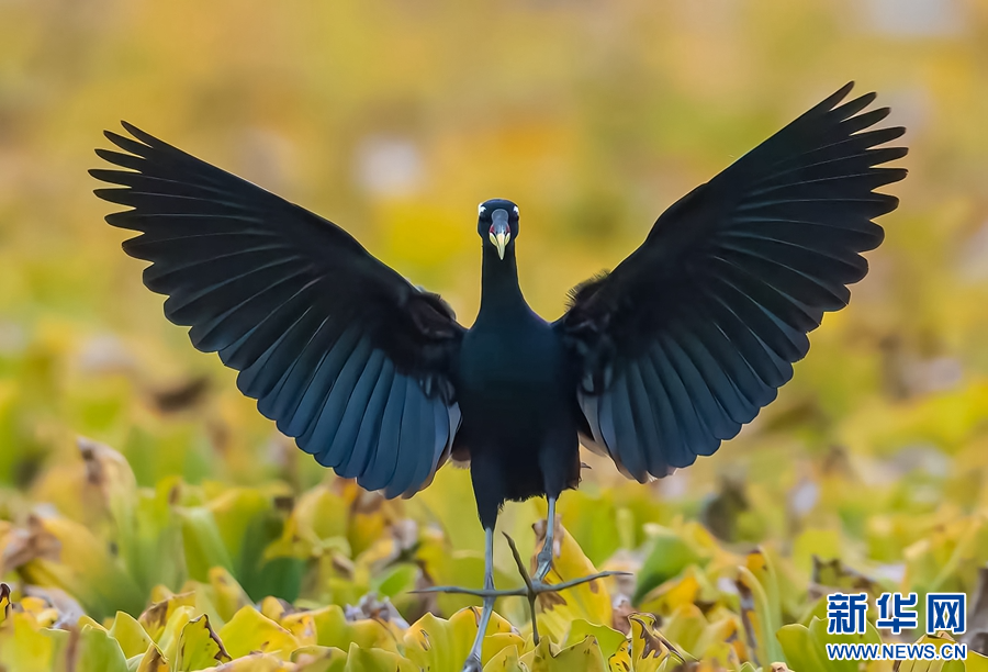 銅翅水雉展翅(1月26日攝)。新華網發(賈雷 攝)