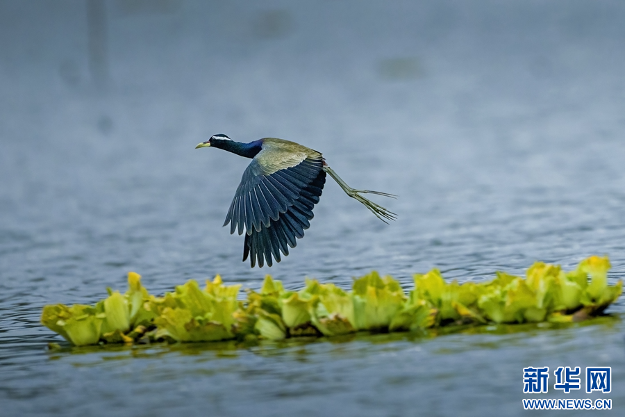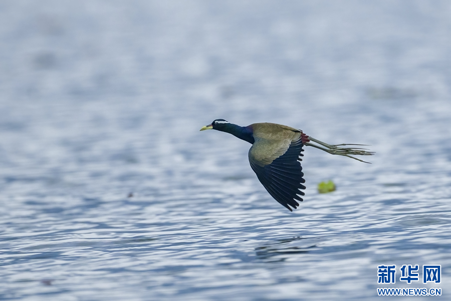 銅翅水雉在湖面上飛(1月26日攝)。新華網發(杜銀磊 攝)