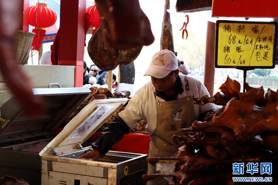 顧客購買臘肉和火腿鴨(1月24日攝)。新華網發(楊雯 攝)