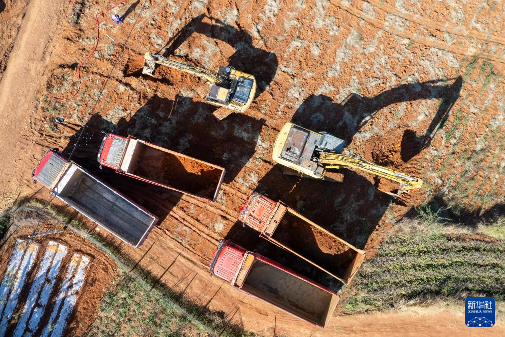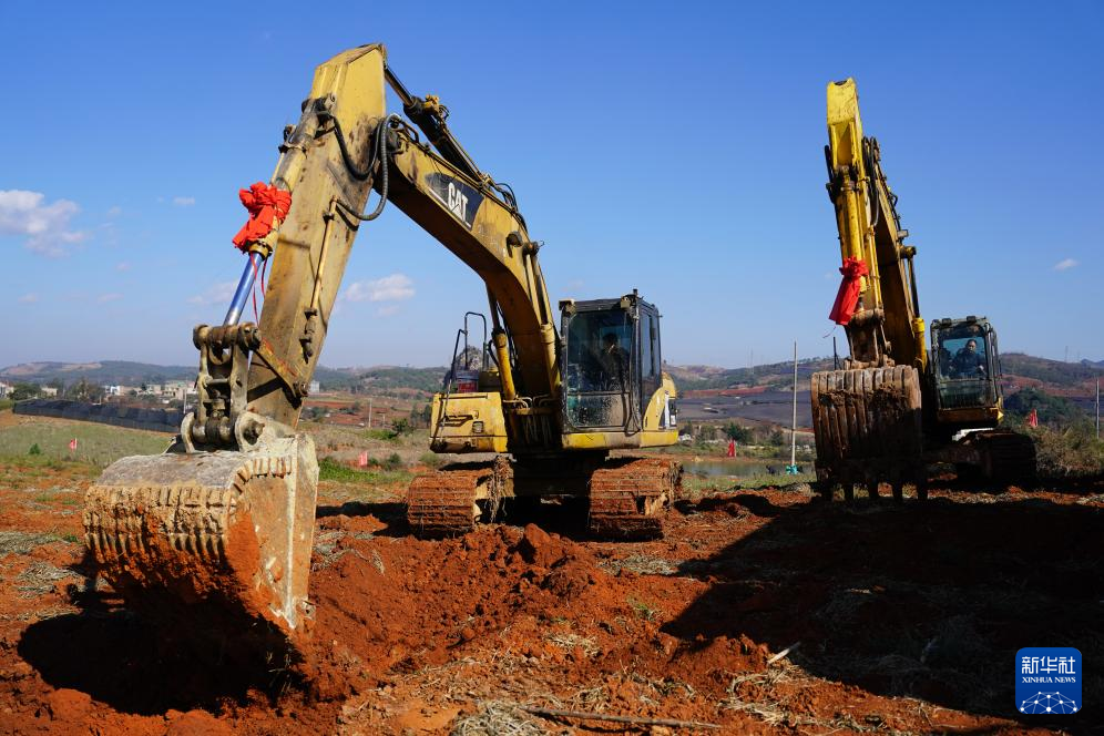 1月30日,大型機械在云南文山文蒙鐵路項目施工現場施工(無人機照片)。