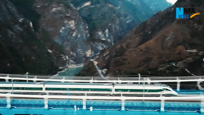 火車飛馳,駛過虎跳峽金沙江鐵路大橋
