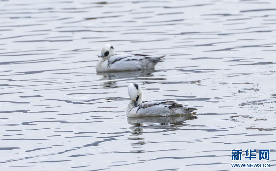 兩只斑頭秋沙鴨同框 (1月27日攝)。新華網發(朱邊勇 攝)